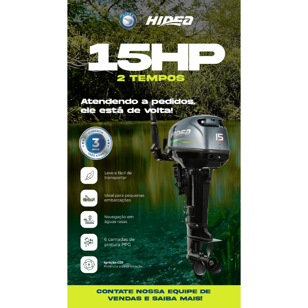 Potente, leve e eficiente, o Motor de Popa Hidea 15 FHS com partida manual entrega desempenho confiável e excelente economia de combustível.